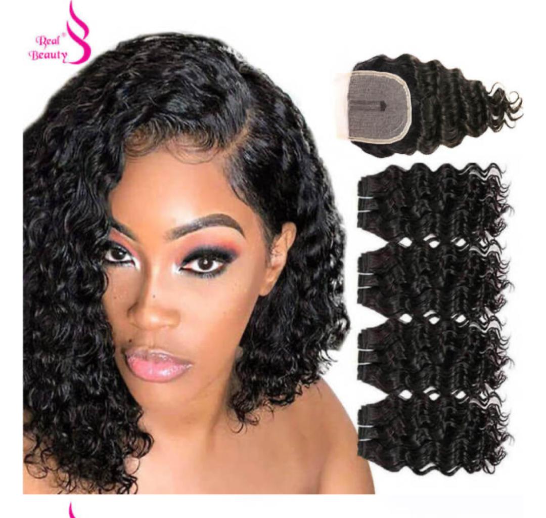 Real Beauty Brazilian Deep Wave 4Bundles with 1PC 4×1 Lace Closure For Women 50G/PC 100% Human Hair Weave Bundles